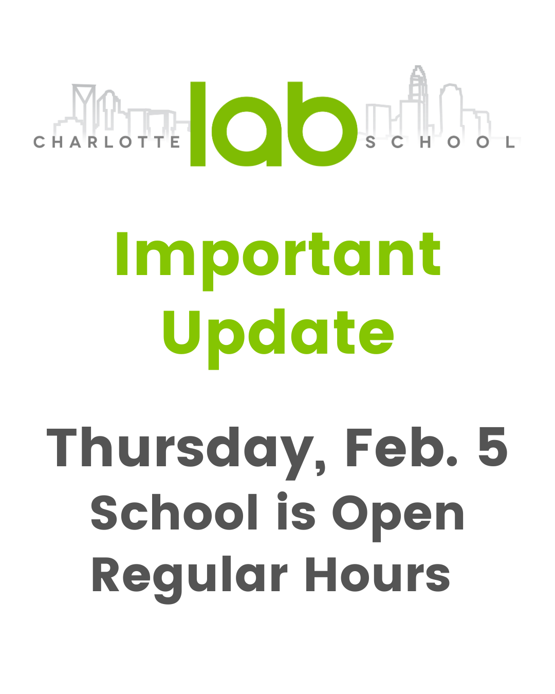 Charlotte Lab School will be open on our regular schedule tomorrow, Thursday, February 5.